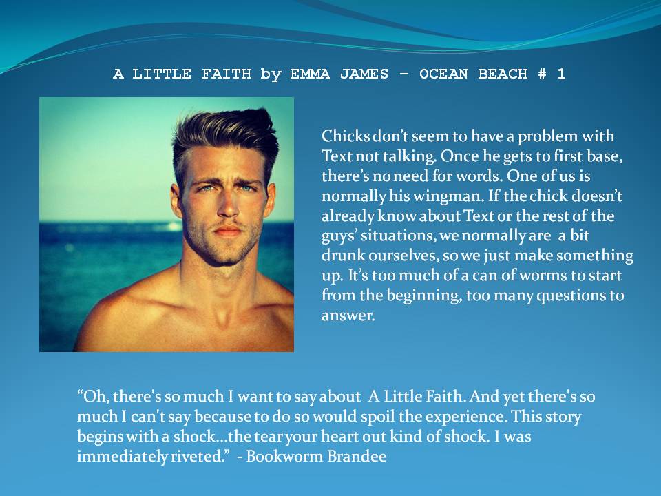 Emma James did a brilliant job writing this book. A Little Faith is a story with multiple layers. Each chapter is written from a different character’s POV. The story flows beautifully. This story illustrates the past and the present with perfection. Each character is vibrant. The prologue had me hooked within the first few paragraphs. I was mesmerized and could not put the book down. Some would say it ended on a cliffhanger but I would define it as an intermission. The complete story is going to unfold in several books. The Men of Ocean Beach are demanding their story be told thoroughly. They are demanding that they all get their happily ever after together.